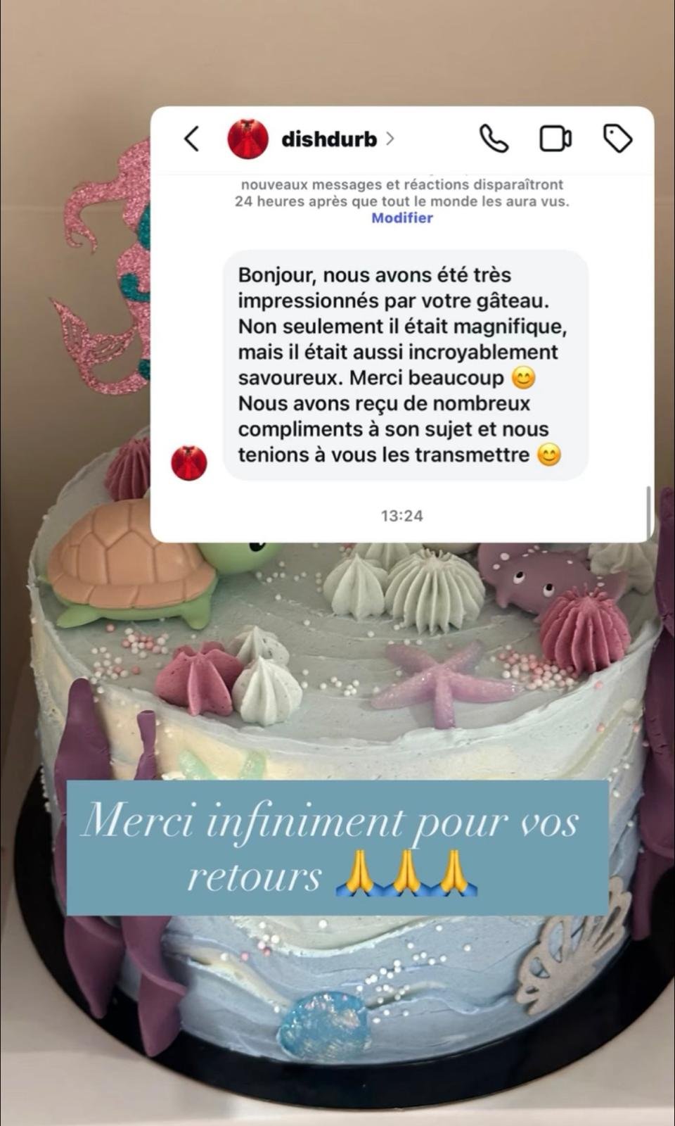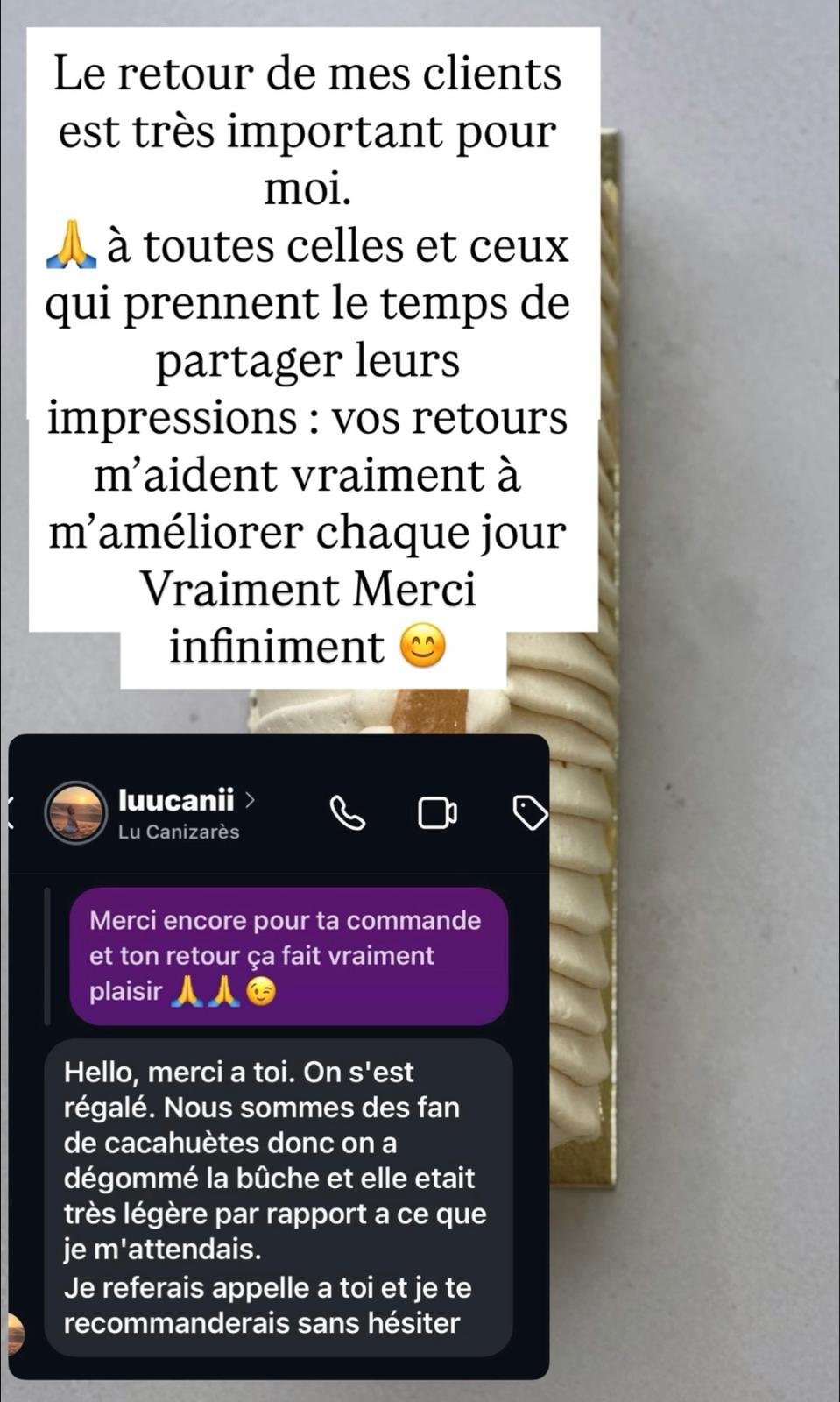 Bonjour, nous avons été très impressionnés par votre gâteau. Non seulement il était magnifique, mais il était aussi incroyablement savoureux. Merci beaucoup 😊 Nous avons reçu de nombreux compliments à son sujet et nous tenions à vous les transmettre 😊